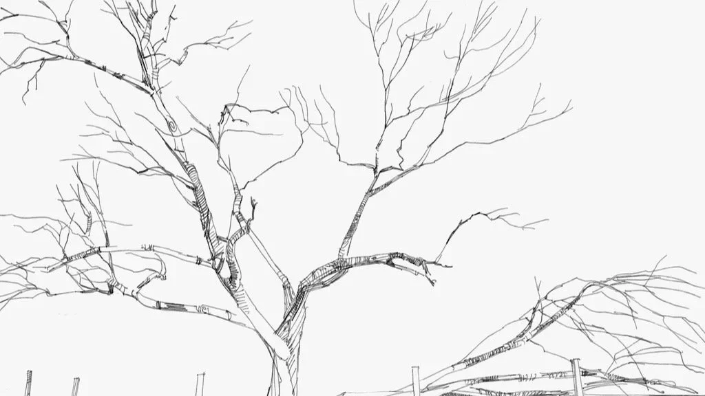 During this winter 2025-2026, I’m drawing trees on my property and around my local town. The general lack of leaves reveals their structure and their impossibly long branches. The project is ongoing. When completed, the series will be made into polymer-plate etchings and printed in editions of 5.